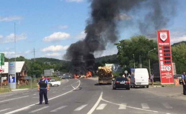 «Слышны выстрелы автоматов и взрывы боевых гранат. Сообщается также, что два основных выезды из города блокированы. Кроме того, жители 5-этажек, которые расположены у выезда из города, сообщают о пожаре на одной из АЗС. По каким причинам возникло возгорание, пока неизвестно», — говорится в сообщении KarpatNews.