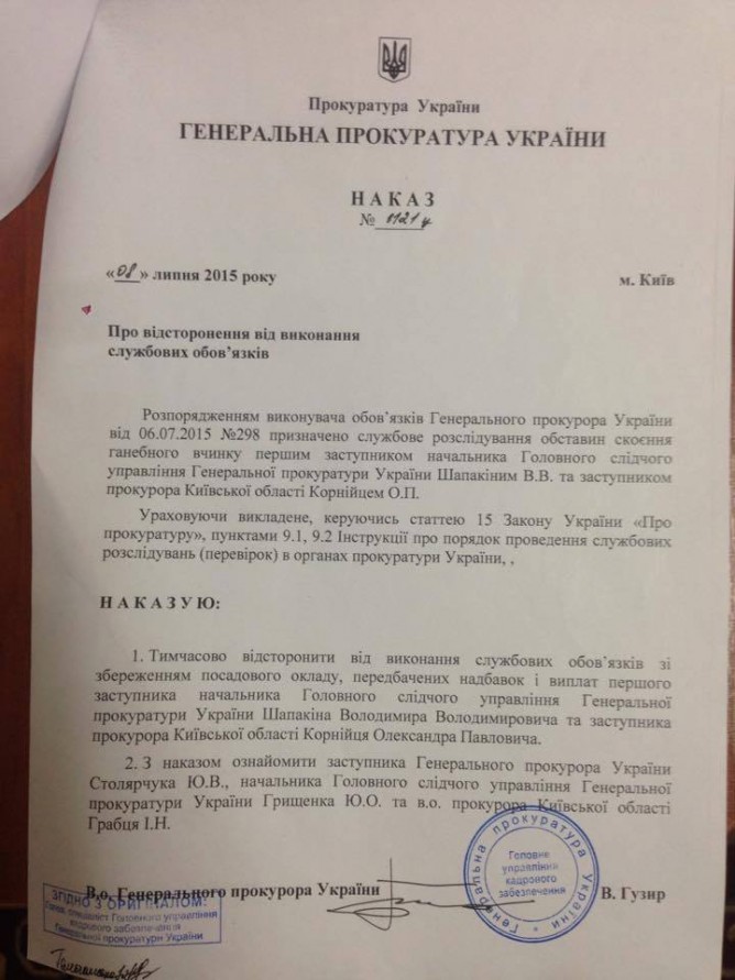 «Это сюр. Оказывается, прокурорские чиновники, у которых на минувшей неделе прошли обыски, до сих пор не уволены! В приказе и.о. генпрокурора Владимира Гузыря говорится, что чиновников отстраняют временно, за совершение „позорного поступка“. О каком именно поступке идет речь, не уточняется, но, очевидно, степень „позора“ еще не настолько велика, чтобы чиновников увольнять», — написал он.