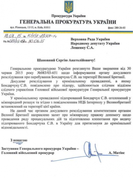 «Согласно сообщению бюро Интерпола в Великобритании, Бондарчук установлен на территории этой страны», — заявили в ГПУ.