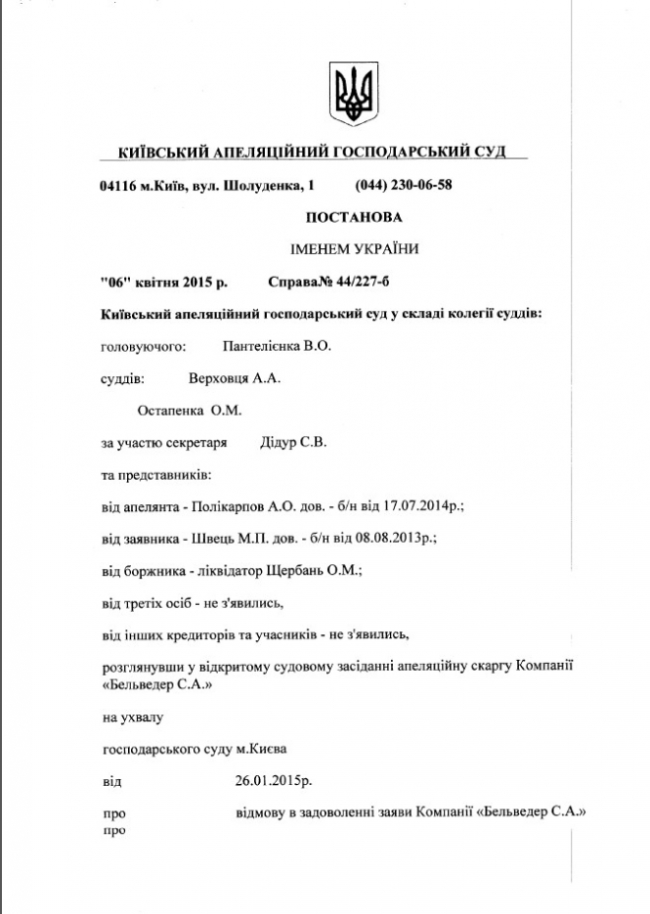 Высший хозяйственный суд Украины вернул судебное дело компании «Бельведер Украина» в Апелляционной хозяйственный суд Киева с формулировкой «для уточнения деталей».