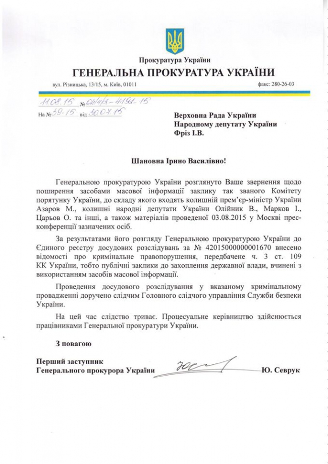 Генеральная прокуратура Украины возбудила уголовное дело по факту заявлений так «Комитета спасения Украины», созданного в Москве экс-премьером Николаем Азаровым. Об этом 15 августа сообщила в Facebook нардеп от БПП Ирина Фриз, передает Капитал со ссылкой на Українські Новини.