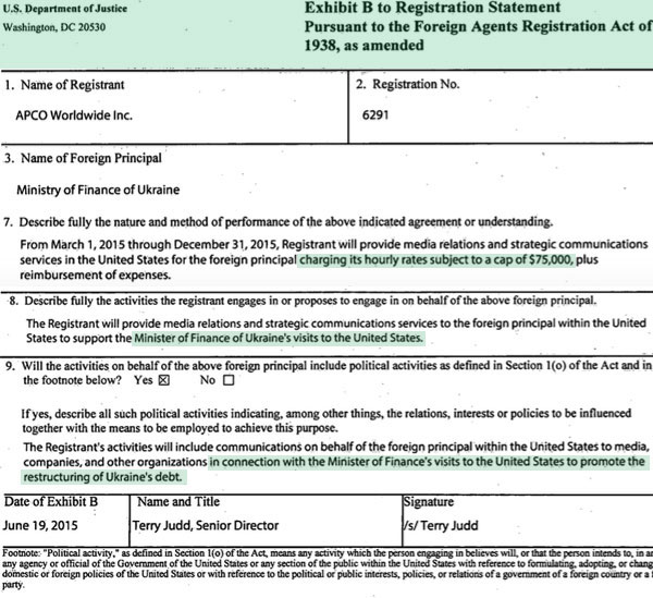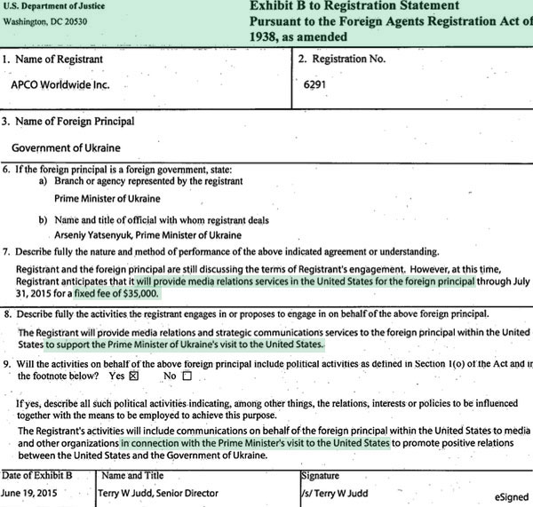 Как пишет в своем блоге на «Украинской правде» народный депутат Сергей Лещенко, отчеты АРСО в Минюст США свидетельствует о том, что их вашингтонский офис заключил договор на продвижение украинского правительства в июне 2015 года.