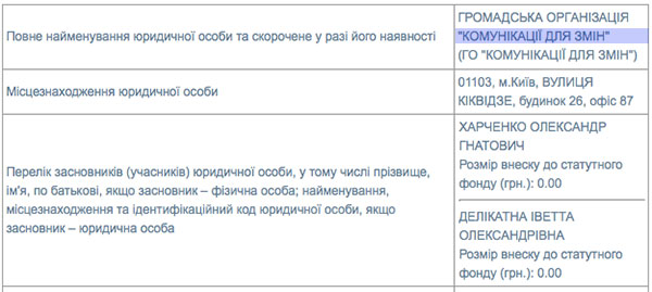 По словам Лещенко, в соответствии с государственным реестром, общественная организация «Коммуникации для изменений» была создана в октябре 2014 года и имеет двух учредителей — Александра Харченко, который является руководителем «Центра исследований энергетики» — энергетической аналитической структуры, «созданной Ринатом Ахметовым для формирования общественного мнения», и Иветту Деликатную, которая является советником Мининформполитики.