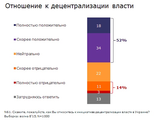 Согласно исследованию TNS On-line Track за август 2015 года, 52% украинцев положительно оценивают инициативу децентрализации власти.
