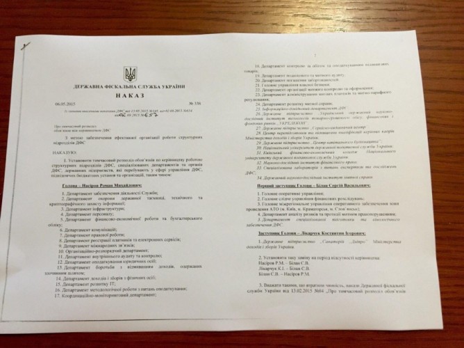 Глава Государственной фискальной службы Роман Насиров временно перераспределил обязанности по управлению подразделениями ведомства между собой и своими заместителями.