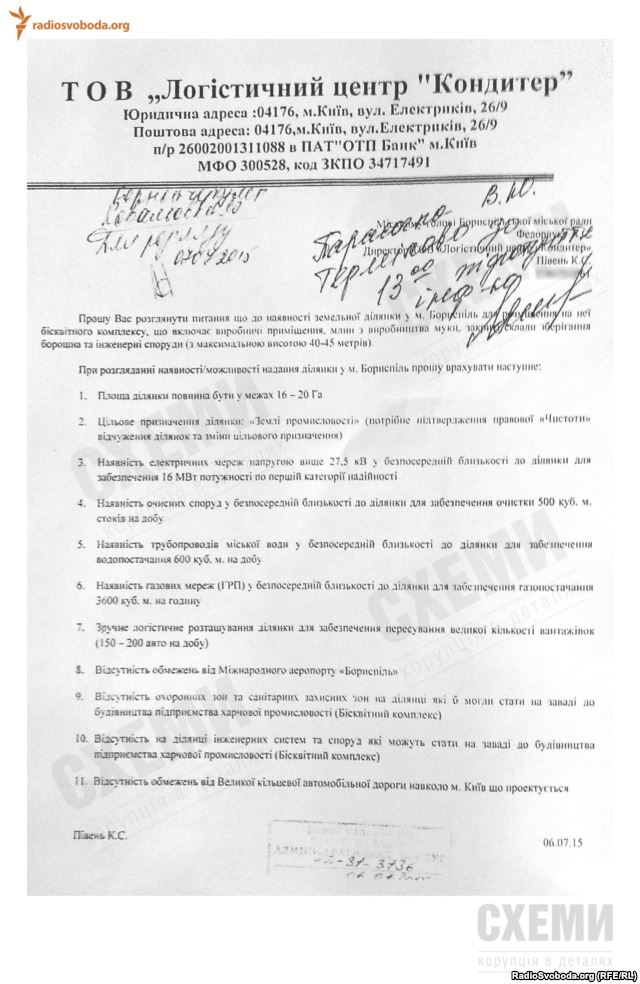 Общественные активисты и оппозиционные депутаты заявили, что такую схему предложил мэр города Анатолий Федорчук, к которому в начале июля обратился «Бисквитный комплекс «Рошен» по вопросу о выделении земли на строительство завода.