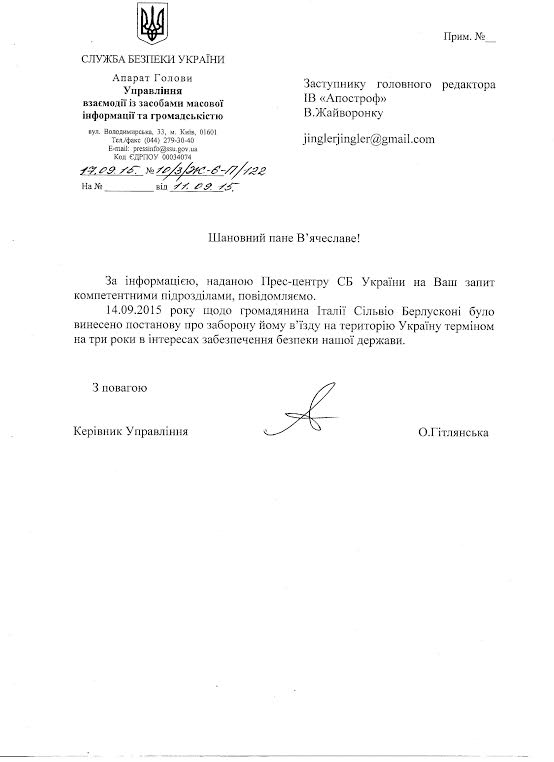 «14.09.2015 года относительно гражданина Италии Сильвио Берлускони было вынесено постановление о запрете ему въезда на территорию Украины сроком на три года в интересах обеспечения безопасности нашего государства», — говорится в документе.