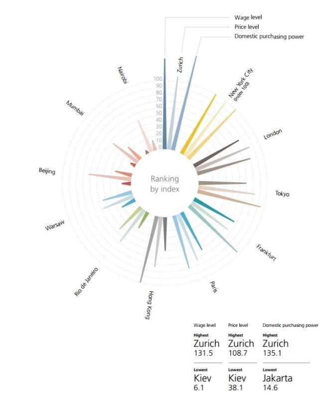 Согласно этим данным, житель Цюриха в среднем получает 41 доллар в час (после уплаты налогов), что в 21 раз превышает зарплату киевлянина. При этом стоимость жизни различается всего в 2,8 раза.