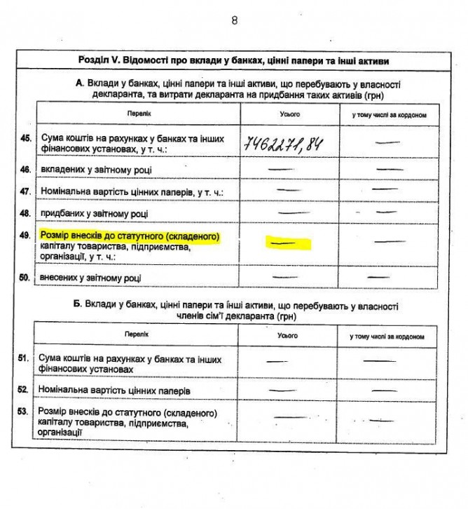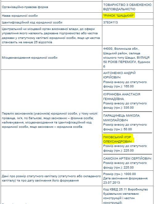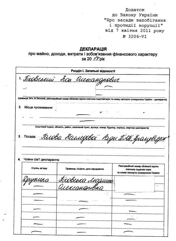 Согласно утвержденной формы подачи декларации о доходах, Пиковский обязан предоставить информацию о размере своих взносов или взносов членов своей семьи в уставный капитал общества, предприятия или организации. Однако в декларации чиновника за прошлый год в этом разделе стоит прочерк.