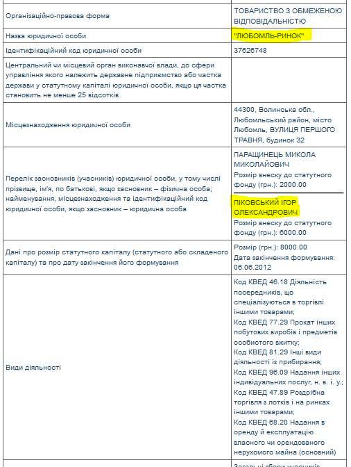 Вместе с тем, по данным ЕГРПОУ, главный столичный томоженник по состоянию на 2014 год и сейчас владел долей по меньшей мере в трех украинских фирмах: ООО «Любомль-рынок» (предоставление в аренду и эксплуатацию недвижимого имущества): совладелец с 2012 года, размер доли — 60%; ООО «Рынок „Шацкий “» (предоставление в аренду и эксплуатацию недвижимого имущества): совладелец с 2012 года, размер доли — 25% (с июля 2015 года фирма находится в состоянии ликвидации); ООО «Генотест» (технические испытания и исследования): совладелец с 2010 года, размер доли — 2%.