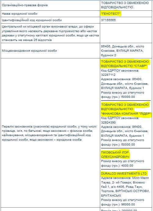 Кроме того, доли в «Генотест», зарегистрированном официально в Енакиево (Донецкая область), имеют ООО «Ставр» и ООО «ФК „Лидер “». Сейчас их конечными бенефициарами указаны граждане ЮАР Ван Геердена и Ван Зил.