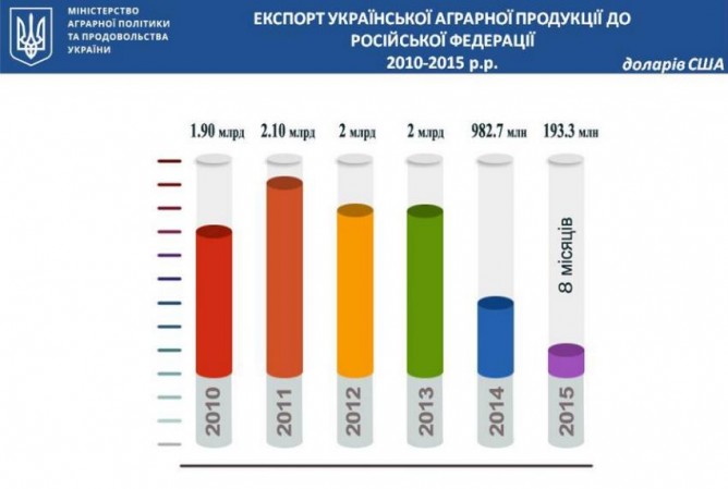 Павленко также представил динамику экспорта украинской аграрной продукции в РФ в 2010-2015 г.г. Так, объем экспорта в 2010 году составил $1,9 млрд, в 2011 — $2,1 млрд, в 2012 и 2013гг. по $2 млрд.