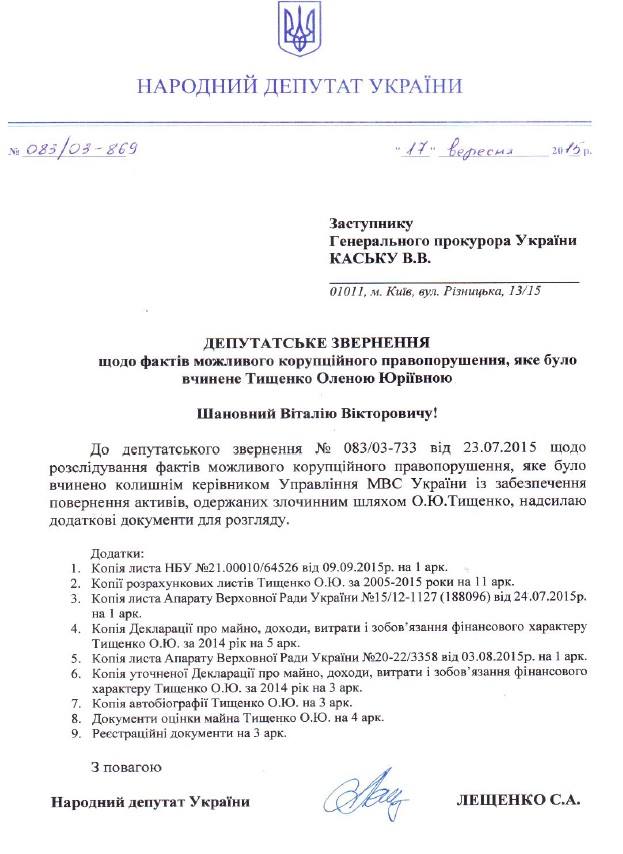 Народный депутат Сергей Лещенко (БПП) заявил, что получил официальное подтверждение, что в отношении подавшей в отставку начальника департамента по возврату незаконно полученных активов при Министерстве внутренних дел Елены Тищенко возбудили уголовное дело.