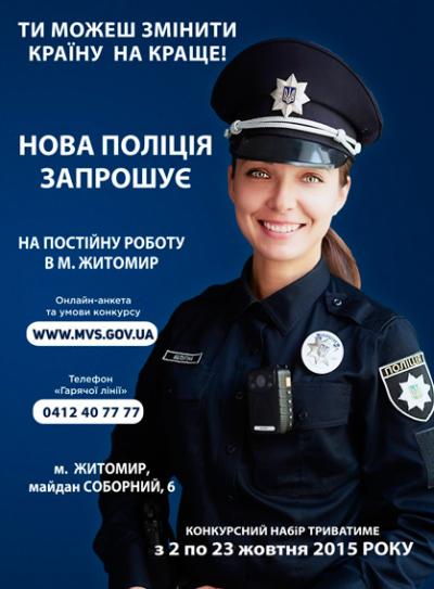 «С 2 по 23 октября 2015 года в г. Житомире будет проводиться набор в новую патрульную полицию. Желающие изменить страну к лучшему могут подать заявку, обратившись лично по адресу: г. Житомир, майдан Соборный, 6 (помещение областного муздрамтеатра) или заполнить онлайн-анкету на сайте www.mvs.gov.ua», — говорится в сообщении.