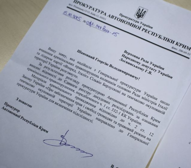Как рассказал на пресс-конференции зампредседателя парламентского комитета по вопросам прав человека, нацменьшинств и межнациональных отношений, зампред межведомственной рабочей группы Кабинета министров по возмещению ущерба от временной оккупации части территории Украины Георгий Логвинский, ранее Берлускони «публично прибыл в Крым, не получая разрешение украинской стороны». Депутат отметил, что «в отношении Берлускони открыто уголовное производство на территории Украины».