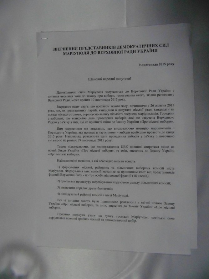 «Прежде всего, они заявили, что ЦИК должна опираться только на новый закон „О местных выборах“ и изменения к закону „О местных выборах“, а также назвали основные вопросы, которые необходимо прояснить перед назначением новой даты выборов. Это, во-первых, формирование комиссий всех уровней по принципу квот представителей фракций Верховной Рады — по три человека от каждой фракции; во-вторых, определения четкой процедуры жеребьевки руководящего состава участковых комиссий, в-третьих, определение порядка печати бюллетеней и, наконец, ликвидация четырех районных избирательных комиссий в городе Мариуполь», — говорится в сообщении.