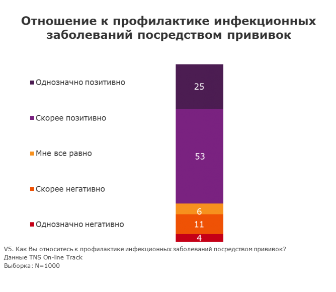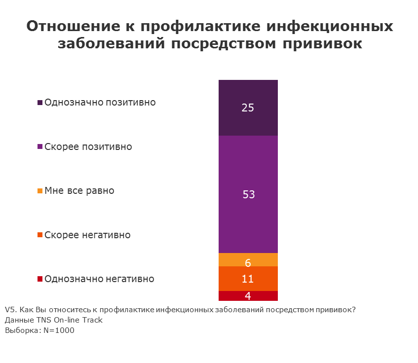 В целом же, по данным опроса, большинство украинцев относятся к прививкам положительно (78%). Негативно к такому виду профилактики заболеваний относится всего лишь 15%. В Восточном регионе суммарная доля тех, кто относится к вакцинации позитивно, составляет 80%, в то время как в Киеве таких на 11% меньше — 69%. А вот противников прививок больше в Северном регионе (21%) и Киеве (20%).