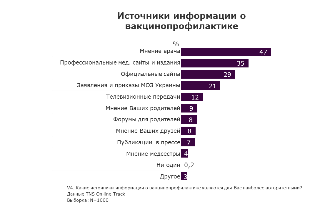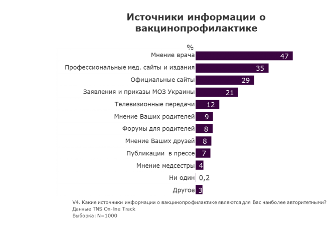 Согласно исследованию, принимая решение о вакцинации, украинцы чаще всего ориентируются на мнение врачей и профессиональные СМИ (47% и 35% сооветственно), а 21% черпает информацию из официальных приказов Министерства здравоохранения.