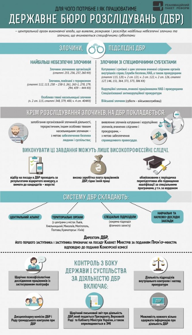 В частности, Бюро должно выявлять, раскрывать и пресекать преступления, связанные с деятельностью организованных групп и преступных организацийа также расследовать случаи пыток и других преступлений, связанных с жестоким, бесчеловечным или унижающим достоинство обращением или наказанием, совершенных прокурорами, следователями (детективами) Национального антикоррупционного бюро, СБУ, органов внутренних дел и сотрудниками других правоохранительных органов.