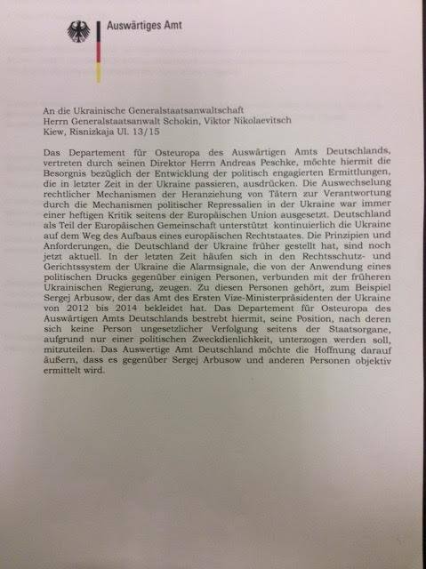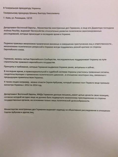 В сети появилась скан-копия письма Министерства иностранных дел Германии к Генеральной прокуратуре Украины с призывом прекратить практику политического преследования представителей предыдущей власти, в частности бывшего первого вице-премьер-министра Сергея Арбузова.