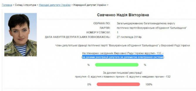 Так, согласно парламентсткой статистике посещений пленарных заседаний, Савченко не присутствовала ни на одном заседании. Как указывается, она ни разу не отсутствовала по уважительным причинам — 132 заседания нардеп пропустила «по неизвестным причинам».