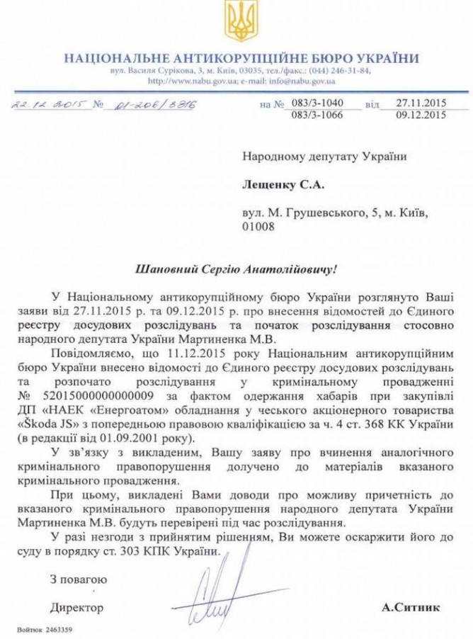 «При этом, изложенные Вами доводы о возможной причастности к указанному уголовному нарушению нардепа Мартыненко будут проверены во время расследования», — сказано в документе.