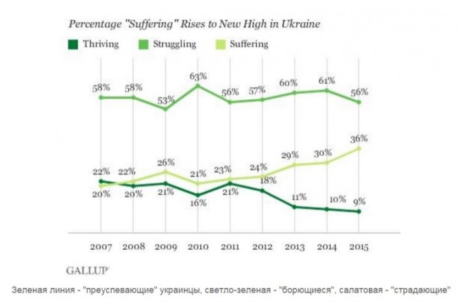 В то же время, согласно исследованию, в 2015 году в Украине вырос процент населения, которое заявляет о «страданиях», достигнув максимума в 36%. Это значительно выше показателей по данному параметру среди большинства постсоветских государств по итогам 2015 года.