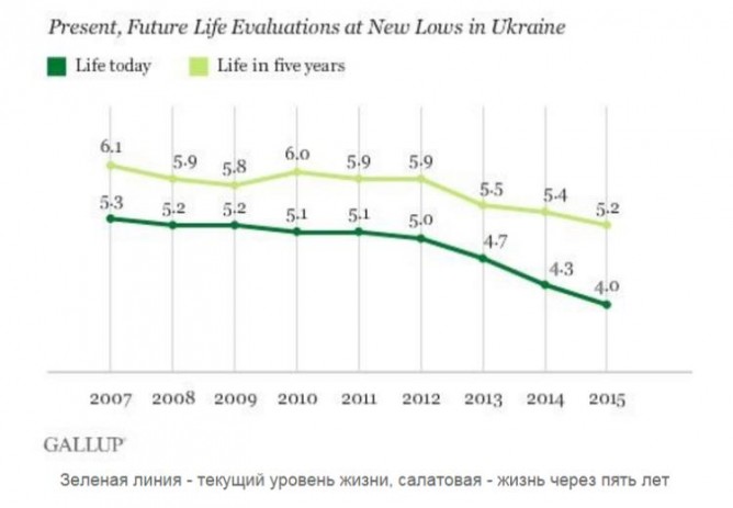 Изнуренные конфликтом на Востоке страны украинцы считают, что уровень их жизни в 2015 году опустился ниже предыдущих показателей. Проведенный среди тысячи украинцев соцпрос свидетельствует о наихудших данных за всю историю наблюдений в стране, говорится в опубликованном в понедельник докладе аналитической компании Gallup.