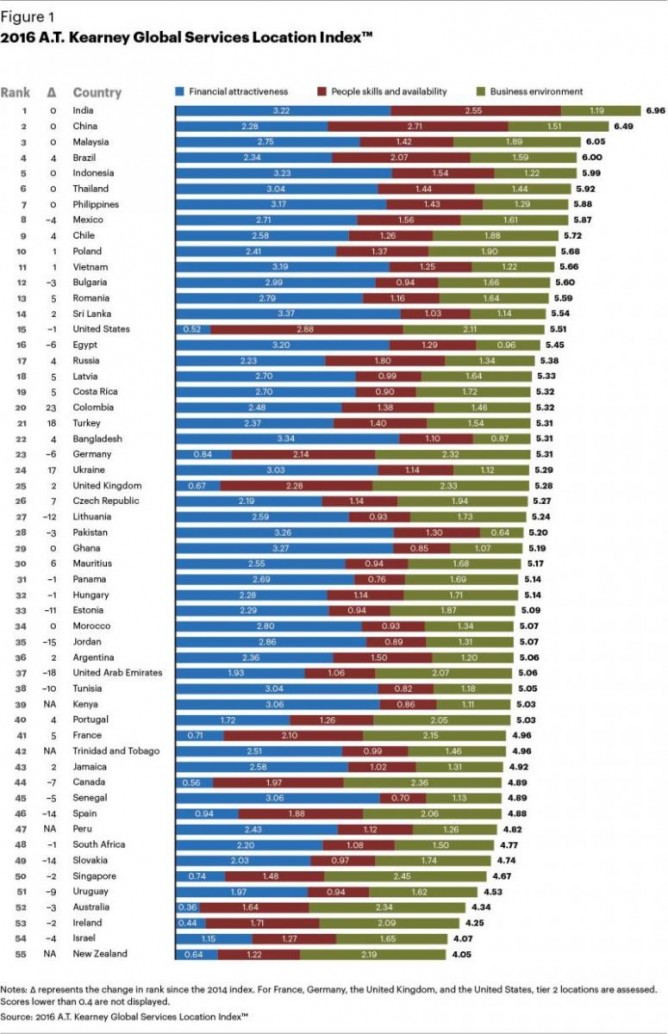 В этом исследовании страны мира ранжируются по оценкам в трех категориях: финансовая привлекательность, навыки специалистов и доступность рабочей силы и бизнес-среда.