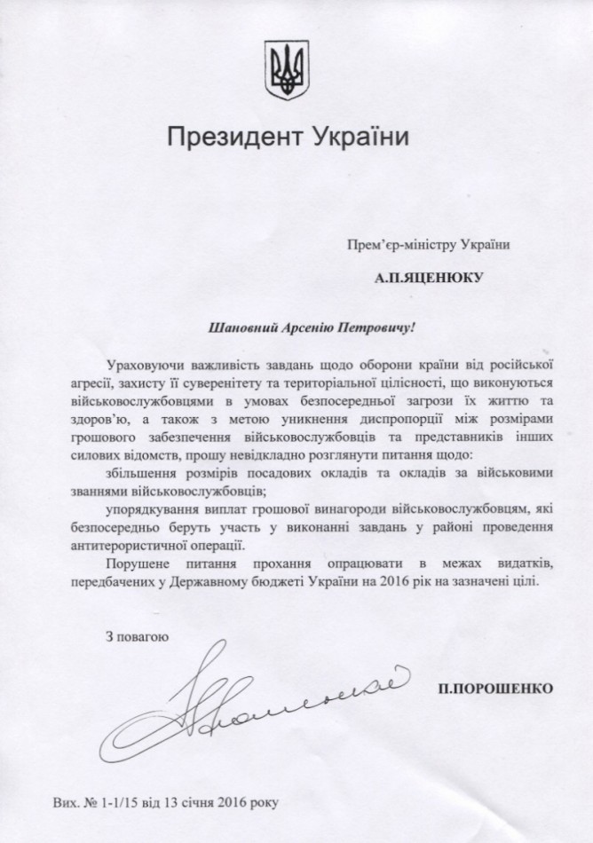 «Поднятый вопрос просьба проработать в пределах расходов, предусмотренных в Государственном бюджете Украины на 2016 год на указанные цели», — говорится в письме.