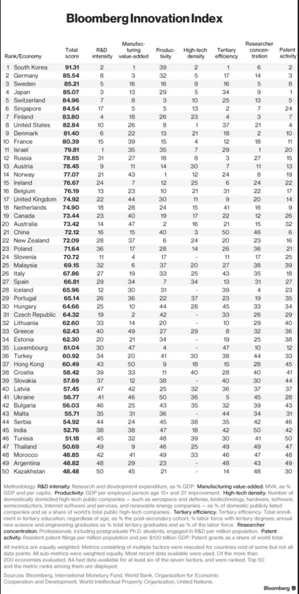 В инновационном рейтинге учитывается 7 факторов, которые относятся к образовательной, научной и технологической сферам. По этим позициям больше всего 91,31 пункта набрала Южная Корея. Второе место у Германии (85,54 пункта), третье — Швеции (85,21). На четвертом месте оказалась Япония (85,07), замыкает топ-5 Швейцария (84,96).