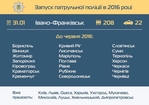 Ивано-Франковск — 11 город, в котором заработал Новый полицейский патруль. Следующие — Херсон (6 февраля), Винница (6 февраля), Чернигов (21 февраля), Кременчуг (27 февраля). Затем — Черкассы, Полтава, Житомир, Черновцы, Ровно, Борисполь, Запорожье, Тернополь, Славянск-Краматорск.