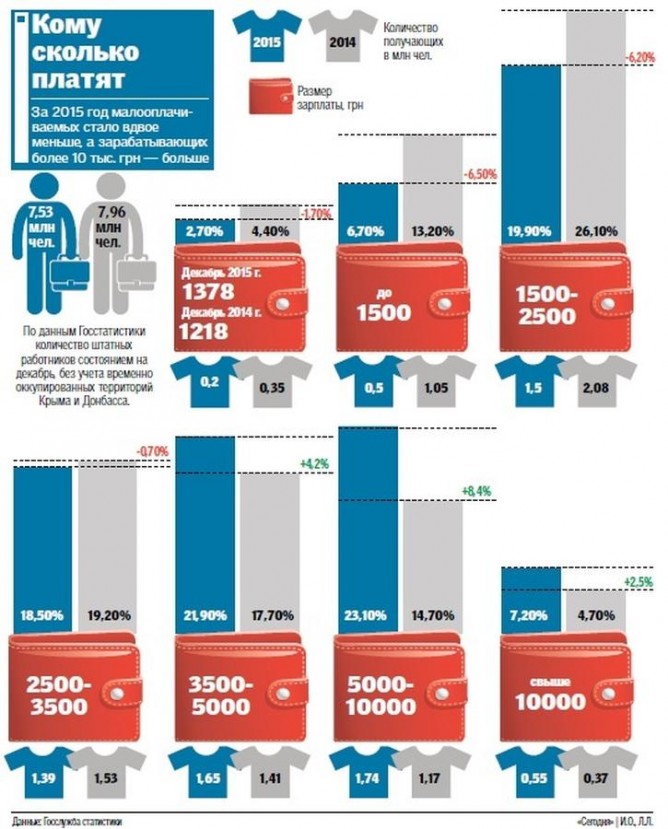 За 2015 год количество работников, получающих минимальную зарплату в 1318 грн, уменьшилось вдвое — до 700 тыс. чел.