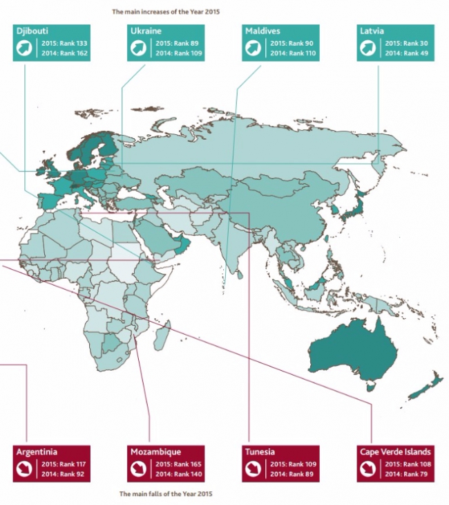 Украина в рейтинге находится на 89 месте и входит в перечень стран, которые показали улучшение роста за год, наравне с Беларусью и Латвией. В 2014 году Украина занимала 109 место.