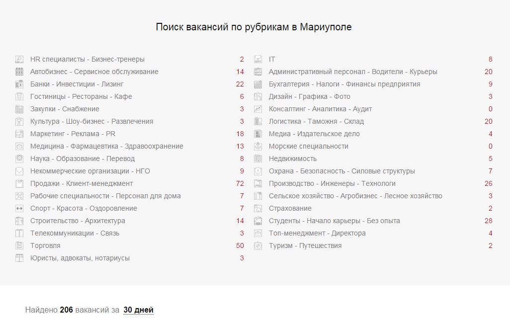 В общем, мариупольских вакансий не так уж и много – чуть более двухсот за последние 30 дней. Для города с таким населением это, конечно, мизер, но, учитывая нынешнюю нестабильную ситуацию, надо и этому радоваться. Но, возвращаясь к работодателям – чьи вакансии можно видеть на rabota.ua? Конечно, есть несколько вакансий компании Метинвест – мастера различных отделений, заместитель начальника цеха и т.д. Для тех, кто не хочет связывать свою судьбу с металлургией, есть вакансии и от известных украинских работодателей – Сильпо, ПУМС, и от иностранных компаний – например, КРКА, Филип Моррис Украина, и от некоммерческих международных организаций, таких как International Medical Corps. Показательно, что, невзирая на небольшое количество вакансий, работа есть и для врачей, и для юристов, для автослесарей и преподавателей английского языка. То есть,при наличии терпения и некоторого количества финансовых ресурсов, работу по профилю найти можно. Если же заработок нужен ранее, всегда можно попробовать себя в административном персонале (20 вакансий), в торговле (50 вакансий), продаже (72 вакансии) или попытаться переквалифицироваться – 28 вакансий в рубрике «Начало карьеры».