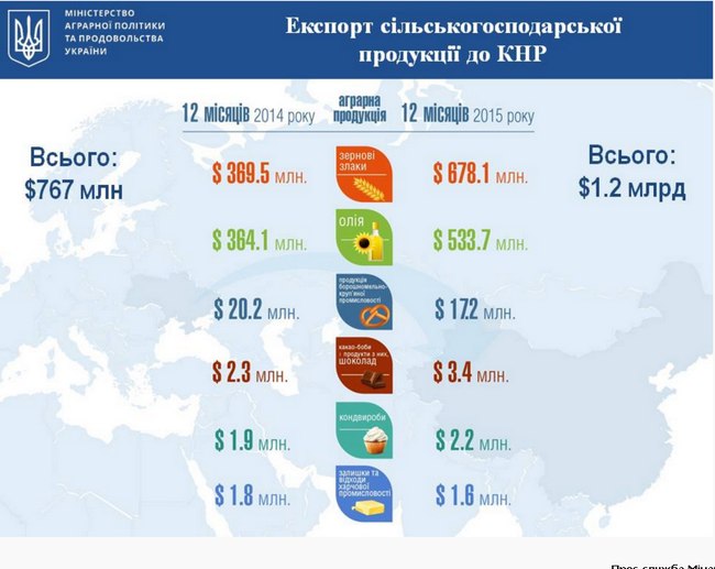 Также министр отметил, что рост экспорта украинской продукции в КНР произошел благодаря увеличению поставок продукции растительного происхождения. В первую очередь это касается зерновых — на $678 млн и масла $534 млн, объемы экспорта которых выросли на 83,5% и 46,6% соответственно.