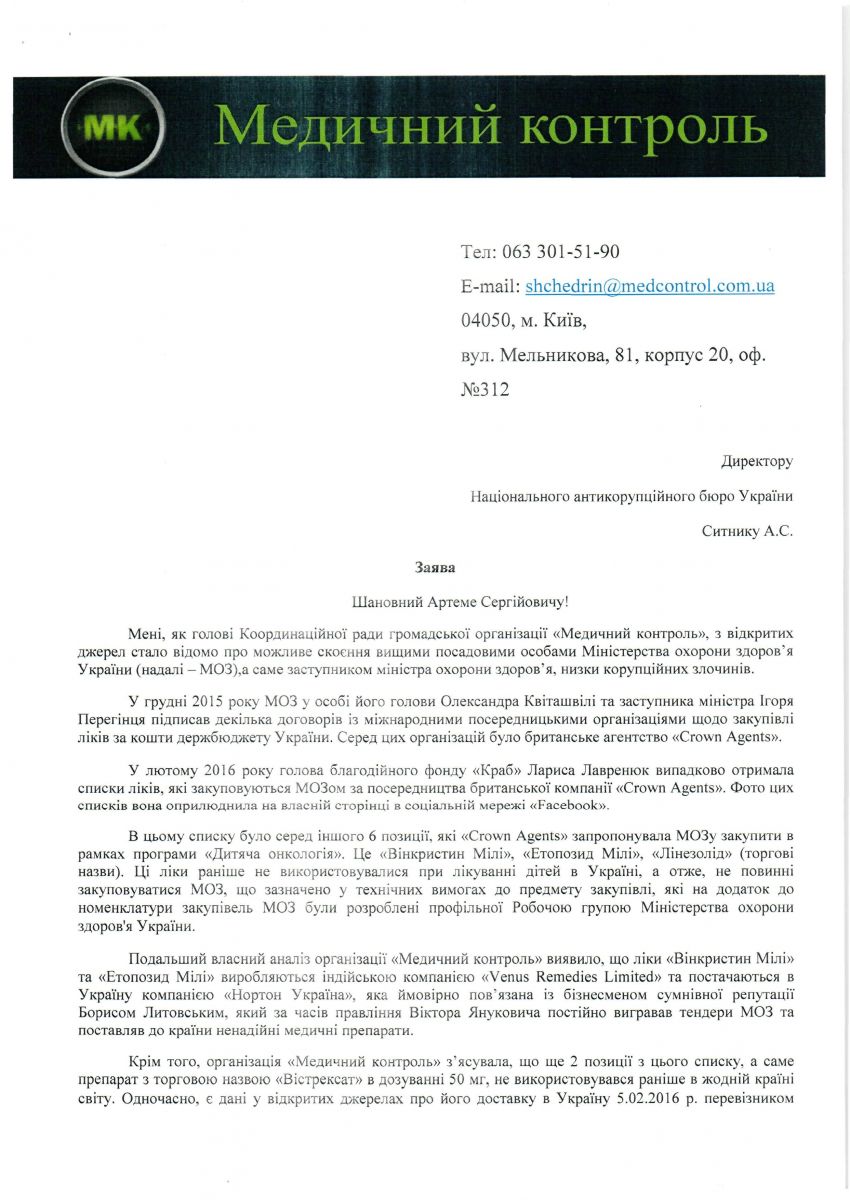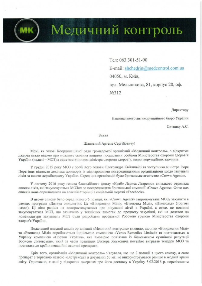 Общественная организация «Медицинский контроль», которая ранее опубликовала документы с перечнем лекарств сомнительного качества и происхождения, закупаемых МОЗ по программе детской онкологии через международных посредников, обратилась в Национальное антикоррупционное бюро Украины с просьбой расследовать данные факты и дать им правовую оценку.
