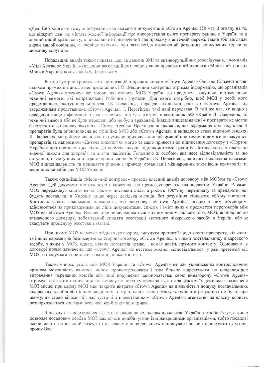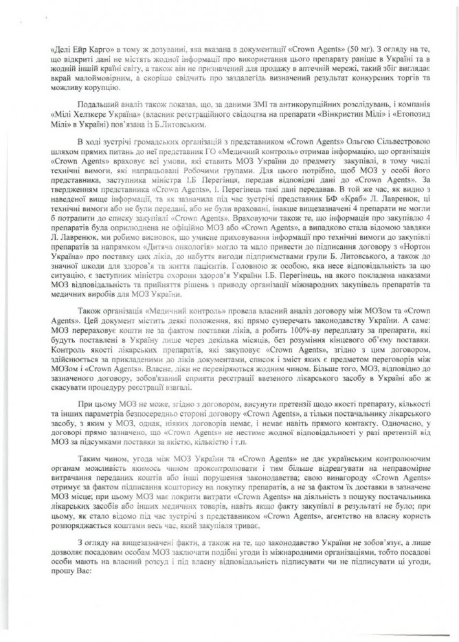 «Контроль качества лекарственных препаратов, которые закупает „Crown Agents“, согласно этому договору, осуществляется по приложенным к лекарствам документами, перечень и содержание которых является предметом переговоров между Минздравом и „Crown Agents“. Собственно, лекарства не проверяются никак. Более того, Минздрав, согласно указанному договору, обязан способствовать регистрации в Украине ввозимого лекарственного средства или отменить процедуру регистрации вообще», — сказано в обращении «Медконтроля» в НАБУ.