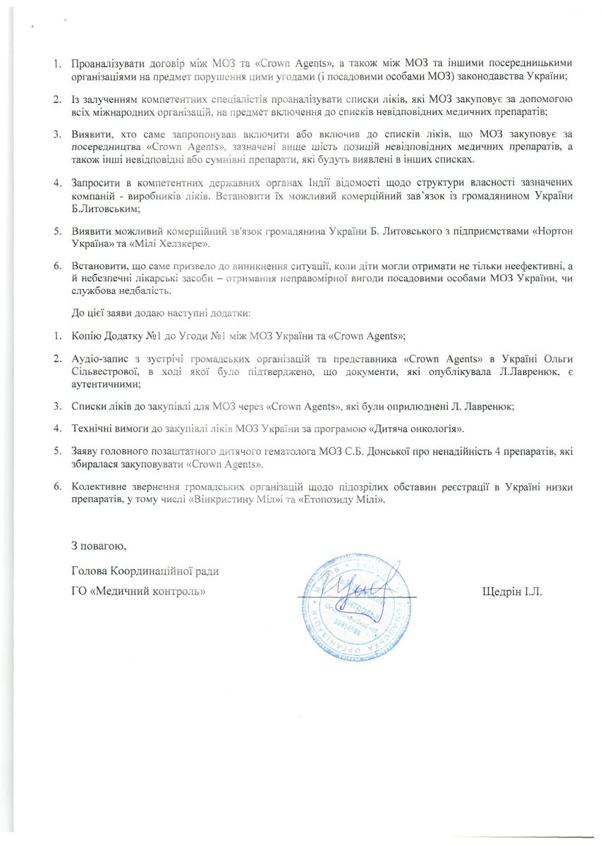 И. Щедрин также призвал подписать соответствующее обращение организации «Пациенты Украины» и «Центр противодействия коррупции», активно лоббировавшие инициативу осуществления закупок лекарств Минздравом через международных посредников.