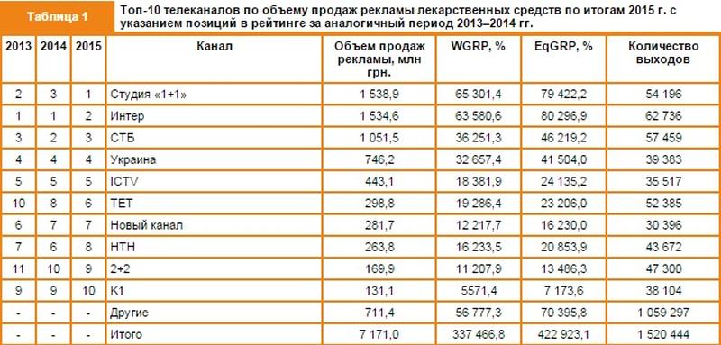 В 2015 году рейтинг телеканалов по объему продаж рекламы лекарственных средств возглавляют национальные каналы: по итогам анализируемого периода 1-е место занял телеканал «Студия «1+1», а канал «Интер», который в предыдущие годы удерживал лидирующую позицию, сместился на 2-е место.