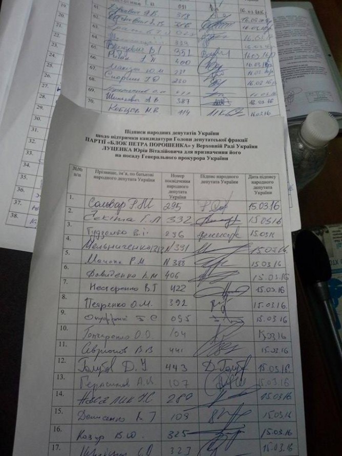Народный депутат от фракции «Блока Петра Порошенко» Руслан Сольвар инициировал сбор подписей за назначение Юрия Луценко на должность генерального прокурора. На сегодняшний день удалось собрать 72 подписи.