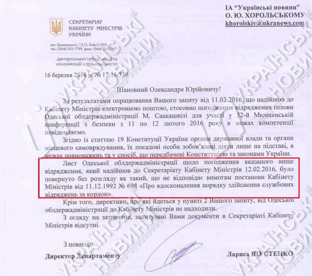 «Письмо Одесской ОГА о согласовании указанной выше командировки, которое поступило в Секретариат КМУ 12.02.2016, было возвращено без рассмотрения, как не отвечающее нормам постановления № 698... Кроме того, директивы, о которых говорится в пункте 2 вашего запроса, от Одесской ОГА в КМУ не поступали», — говорится в ответе.