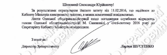 А вот в Кабмине на запрос от 11 февраля ответили, что ни каких писем ни от Саакашвили, ни от Одесской ОГА о согласовании командировки ни в этот день, ни ранее не получали.