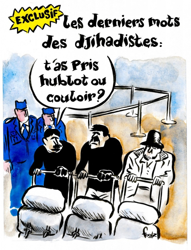 В основу карикатуры положена фотография, сделанная камерами наблюдения в аэропорту Брюсселя, которые запечатлели двух шахидов, двигавшихся к стойкам с тележками для багажа.