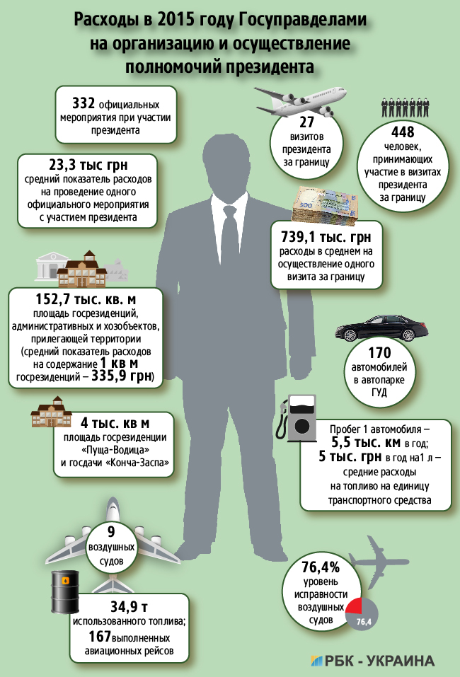 В среднем расходы на проведение одного официального мероприятия с участием президента обходятся в более 23 тыс гривен. Только за один раз за эти деньги можно бы было профинансировать почти 22 минимальные пенсии. А таких официальных мероприятий в 2015 году Порошенко провел 332. За границу с официальным визитом президент летал 27 раз. Количество человек, принимающих в этом участие, составляет почти 450, а расходы — 740 тыс гривен.