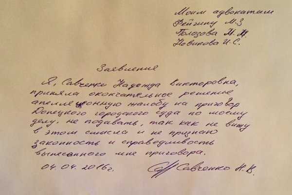 Напомним, завтра, 5 апреля, приговор вступит в силу. Адвокаты Савченко сегодня предприняли последнюю попытку убедить летчицу подать апелляцию.