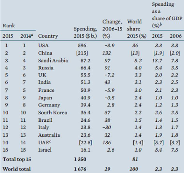 Россия занимает четвертое место, ее военные расходы увеличились в 2015 году на 7,5% до 66,4 миллиарда долларов. Отмечается, что военные расходы России в тоге составили меньше, чем планировалось в бюджете, из-за падения цен на нефть. Россия и Саудовская Аравия также планируют сократить свои военные расходы в 2016 году.