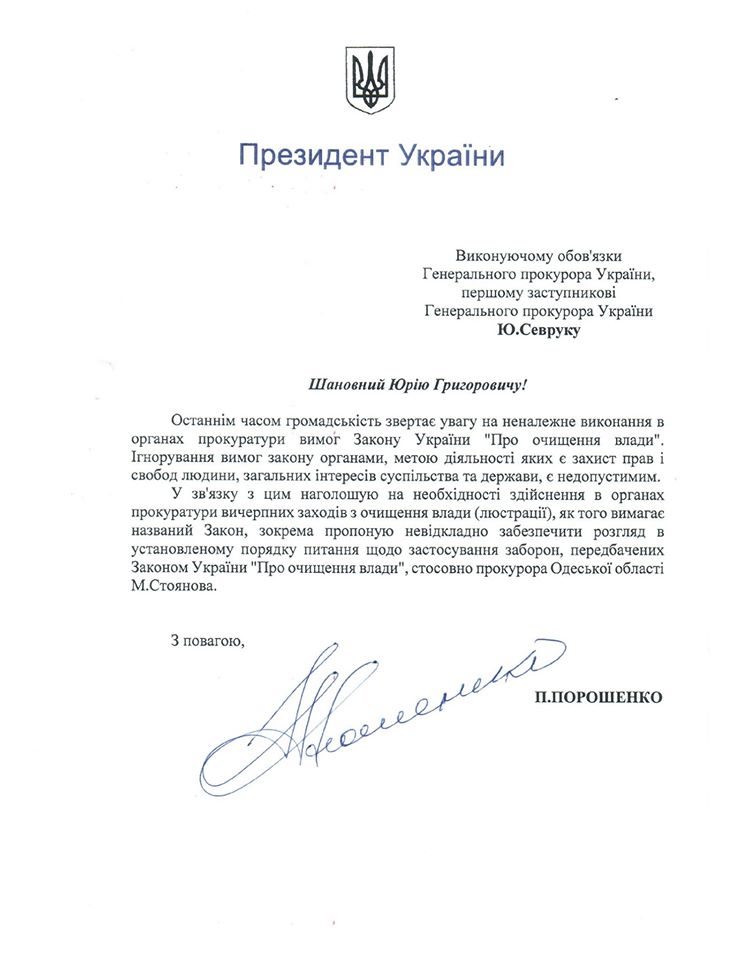 «Президент написал и.о. генпрокурора Ю.Севруку письмо о неотложной необходимости уволить прокурора Одесской области Н.Стоянова в порядке люстрации», — отметил он.