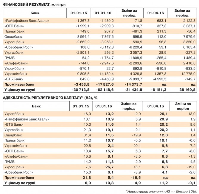 При этом у двух банков группы — Проминвестбанка и государственного Укрэксимбанка значение собственного капитала оказалось отрицательным. Так у Проминвестбанка («дочка» российского ВЭБа), после потери 16,2 млрд. СК за 2015 г, его значение составило минус 10,1 млрд. При этом в пресс-службе Укрэксимбанка, в который редакция обратилась как в один из трех крупнейших банков, объявленных Нацбанком системными (другие два — Приватбанк и Ощадбанк) отказались давать какие-либо комментарии, сославшись на то, что отчетность банка еще находится на стадии подготовки.