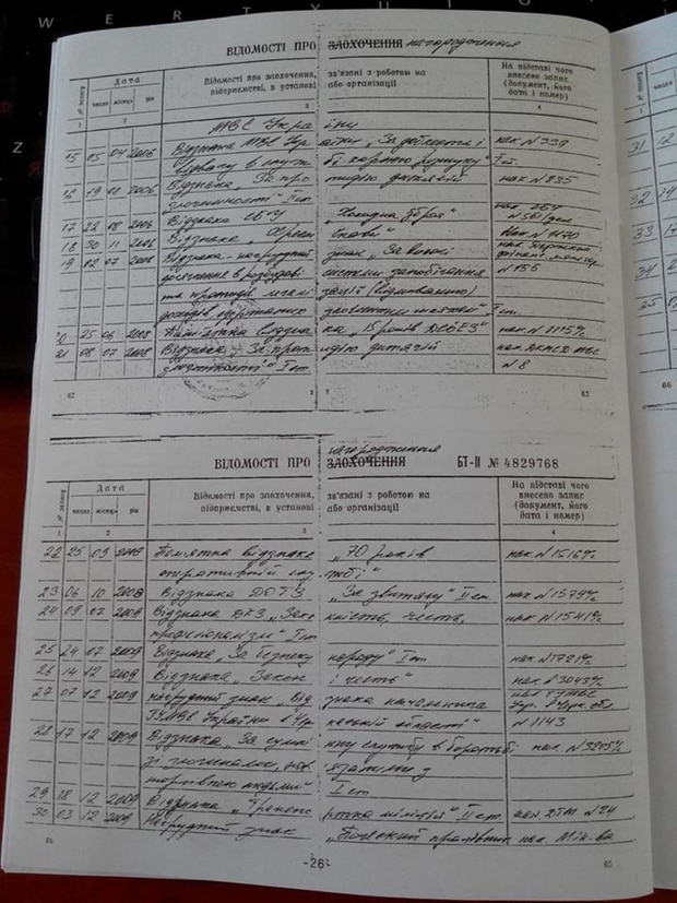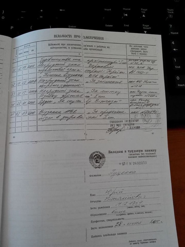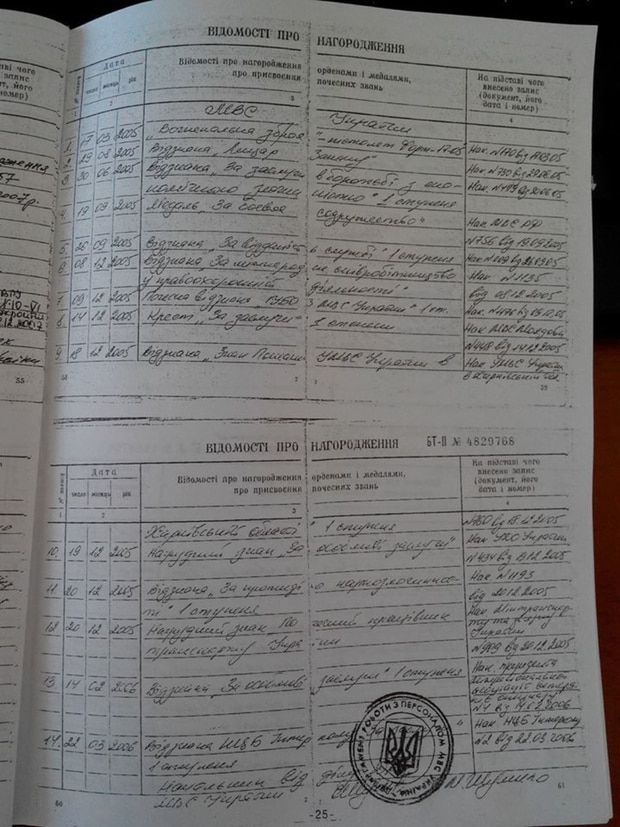 Так, согласно записям в документе, награды выдавались Луценко именно во время работы министром. Первую из них, пистолет Форт, он получил менее чем через полтора месяца после первого назначения в МВД — в марте 2005 года. Еще через три месяца он получил награду «За заслуги в борьбе с экономической преступностью» 1 степени«, а в августе 2005 Луценко стал «Рыцарем закона».
